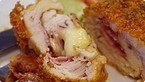 Die eingerollten Filetstücke zuerst in die vorher angesetzte Brühe (kleines Gefäß) wälzen und dann im vorbereiteten Paniermehl.