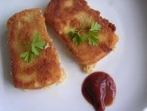 Den abgetuften Käse in dem Instantmehl wenden, dann durch das geschlagene Ei ziehen und zum Schluß in den Semmelbrösel wenden.